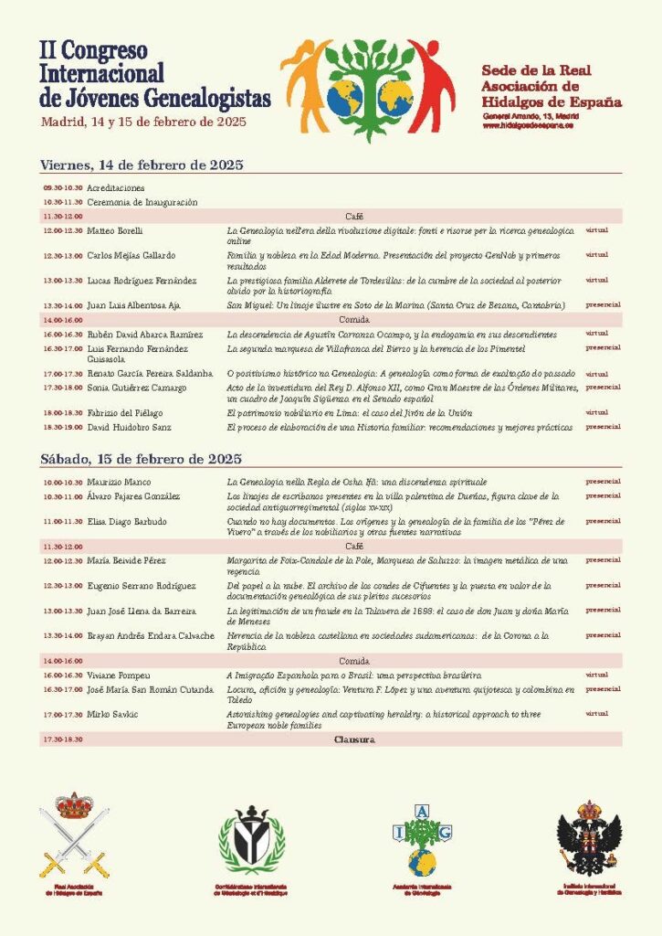 Nuestro fundador ha asistido en calidad de ponente al II Congreso Internacional de Jóvenes Genealogístas “Retrospectiva, actualidad y porvenir de una ciencia historiográfica”, que ha tenido lugar en Madrid, en la sede de la Real Asociación de Hidalgos de España, los días 14 y 15 de febrero del año 2025. Ha intervenido con una comunicación titulada “San Miguel: un linaje ilustre en Soto de la Marina (Santa Cruz de Bezana, Cantabria)”. Se trata del trabajo de investigación de carácter genealógico más importante y de mayor envergadura al que hasta el momento ha hecho frente, y ahora, tras una década de arduas pesquisas, ve la luz en este congreso. Además, durante este 2025 será publicado en la revista Hidalguía, editada también por la citada Real Asociación, un referente a nivel nacional e internacional cuyo objetivo fundamental es la publicación de trabajos científicos de investigación, ensayos, artículos y documentos sobre nobiliaria, heráldica y genealogía, así como de otras disciplinas afines a las mismas.